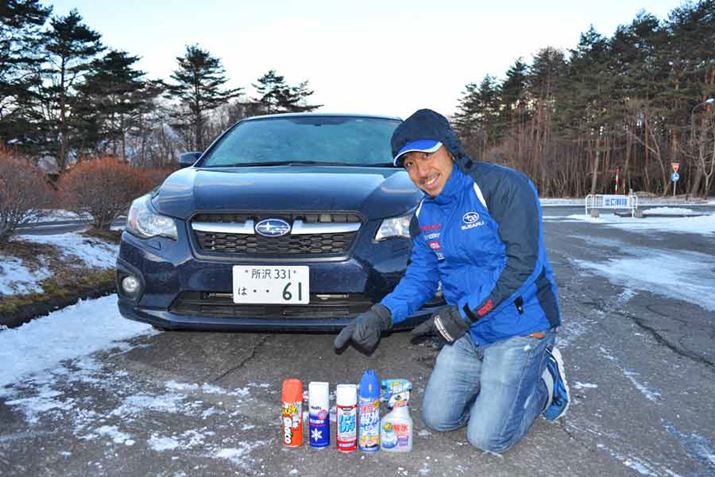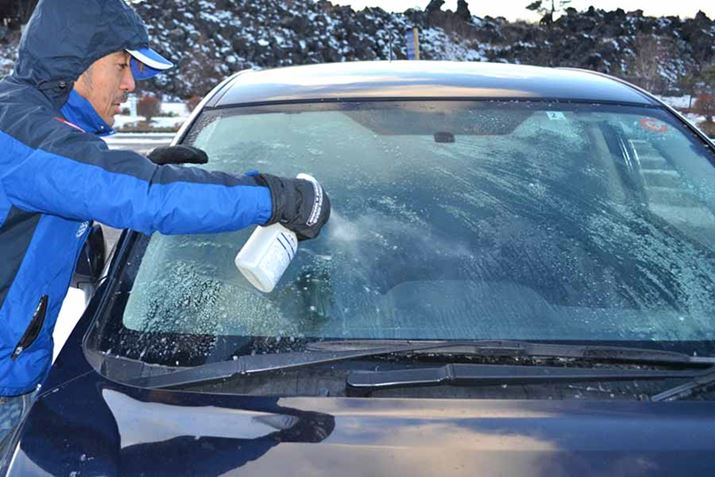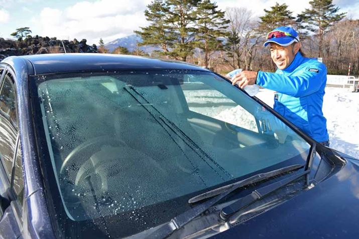 しかし、中にはマイナス40〜50度の厳しい寒さにも対応することをうたうなど、製品のスペックはきわめて高いものがあり、埼玉県所沢市程度の寒さでは製品の本質や真価が見えにくいと判断。そこで、もっと過酷な寒地で解氷テストを実施するべく、群馬県の嬬恋村まで足を伸ばしました(年間平均気温は8度前後!)。浅間山の麓あたりの、標高1,800m付近にある駐車場ではクルマの外気温計がマイナス6度を示し(実施日は12月中旬)、ウィンドウに水をかけると数ミリ級の分厚い氷が張ったので、この分厚い氷をも溶かす能力を備えているのか否かをチェックしたのです。