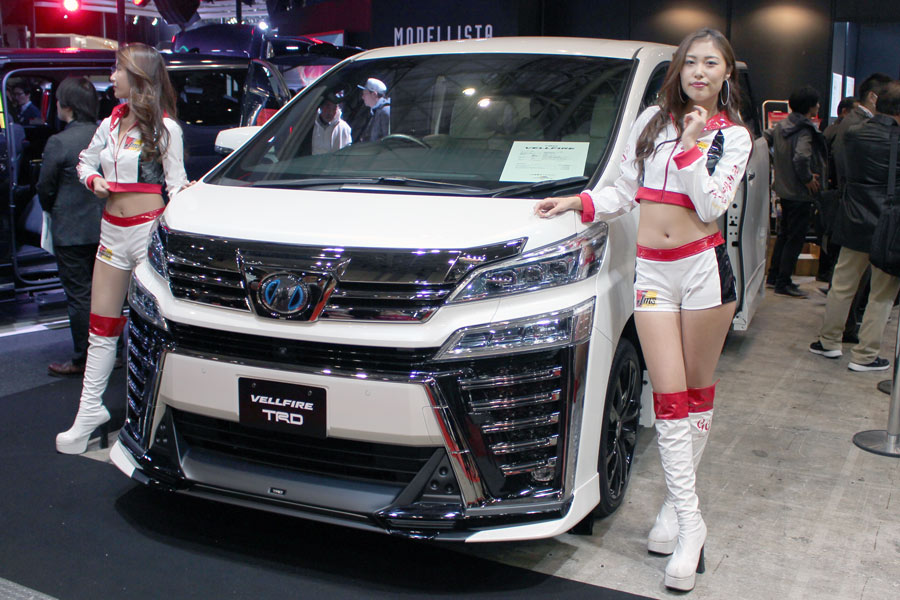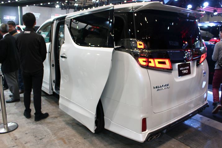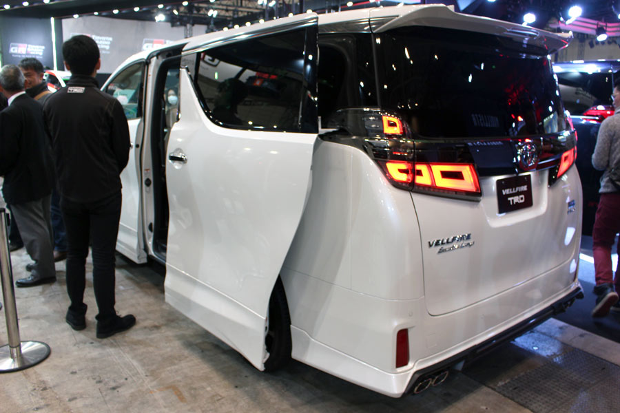 TRDのトヨタ「ヴェルファイア」向け、フロントスポイラー、サイドガード、リアバンパースポイラー&ハイレスポンスマフラー、19インチホイールのセット。フロントスポイラーがさらに強いインパクトを与える