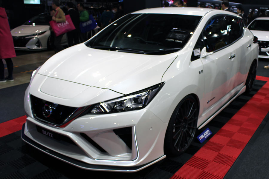 昨年はEVの注目度が世界的に高まったが、チューニングカーの世界ではまだ少数派。会場でBLITZが新型の日産・リーフをベースに電子パーツや足回りを強化したモデルを展示していた