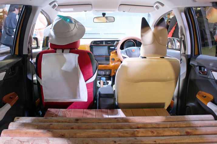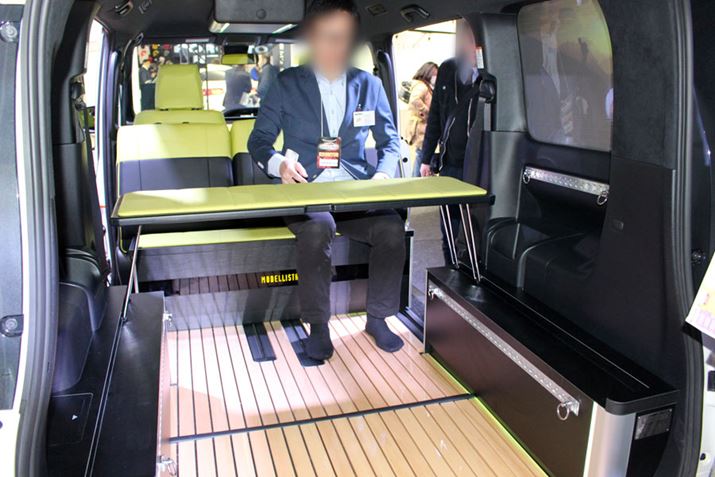 後席は、フルフラットになるほか、写真のように、ウッドデッキ風のフロアにテーブルとイスというレイアウトにも簡単に変更できる。なお、フロア下には、保冷ボックスまで備わっている