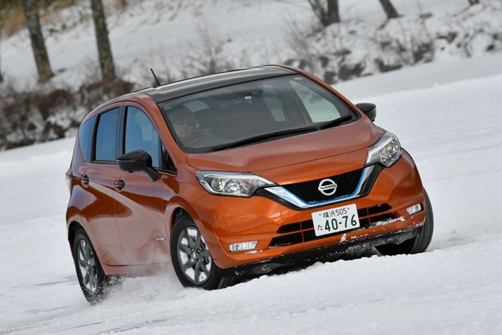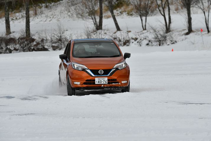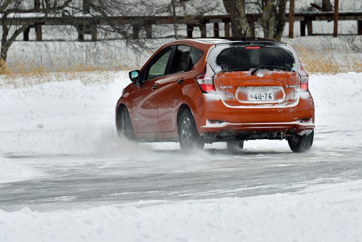 加速と減速をアクセルワークだけで行えるノート e-POWERは、無駄な滑走を抑えられるので氷上走行の安定性にすぐれる