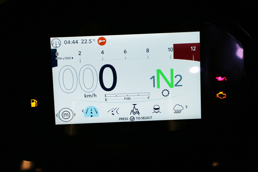 液晶モニターは表示モードを切り替えることができ、下部に表示されるアイコンを選択すればライディングモードを変更することもできる