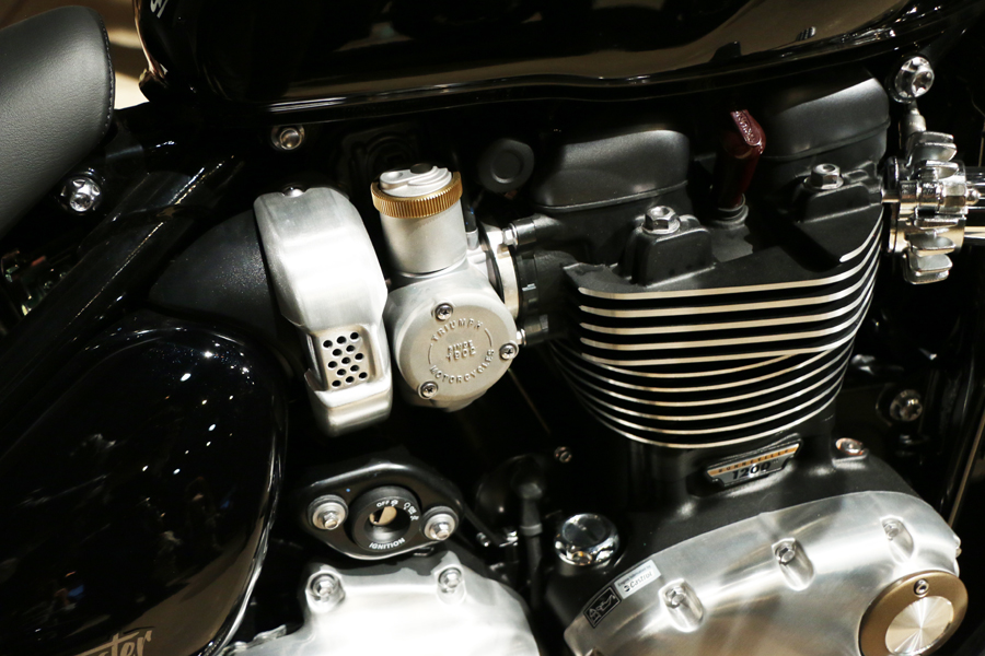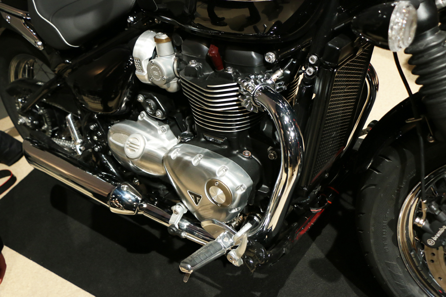 「ボンネビル」シリーズに共通する1,200ccの並列2気筒水冷式エンジンを搭載。過去の空冷エンジンを思わせる冷却フィンが刻まれており、過去に世界最速を誇った同社の「ボンネビル」を思い起こさせるルックスとなっている。最高出力は77PS/6,100rpm、最大トルクは106Nm/400rpm