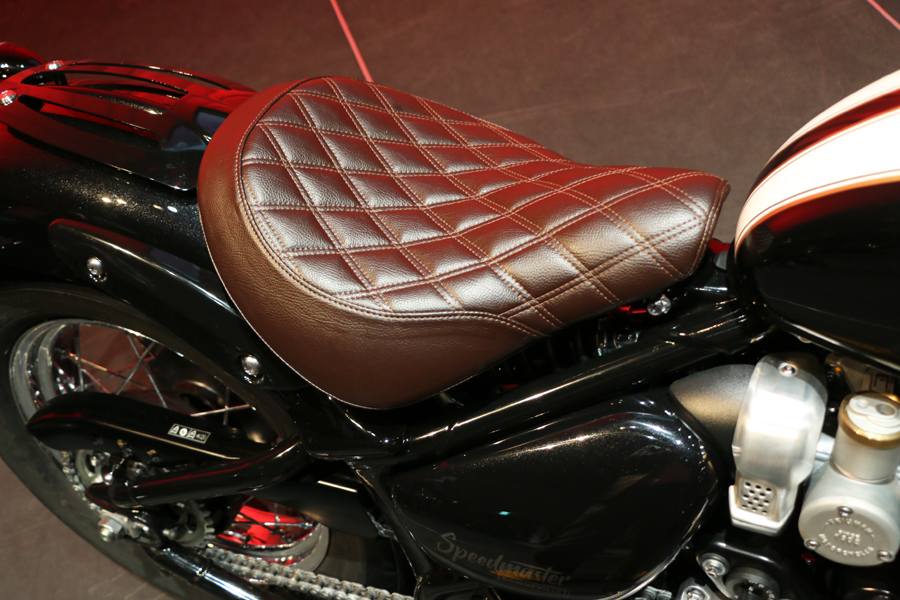 レザー調のシートや手描きのストライプ入りタンクも味わいがある。スタンダードな「ボンネビル スピードマスター」とはまったく違うキャラクターにできるのがたまらない