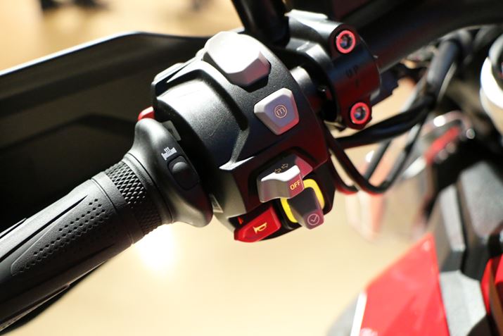 ラインディングモードの切り替えなどは、左手側の小さなジョイスティックのようなレバー(黄色の部分)で行えるようになった。操作性がかなりよく、グローブをつけていても操作に困ることはなさそうだ。なお、アシストをすべてオフにしてすべるタイヤを自分でコントロールできる「OFF-ROAD PRO」というライディングモードも搭載されている