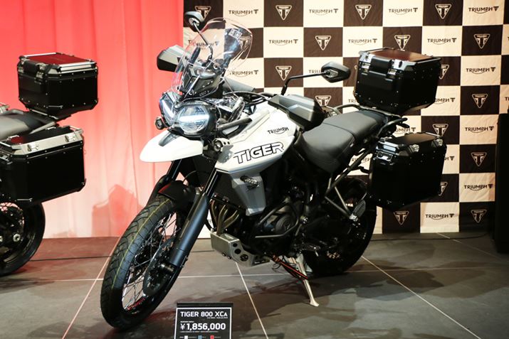 800ccエンジンを搭載したオフロード志向の「タイガー800 XCA」(リアのパニアケースなどはオプション)。サイズは805(全幅)×1,390mm(全高)で、重量は208kg 。パッと見のデザインは「タイガー1200 XCA」と大きく変わらない。価格は185万6000円