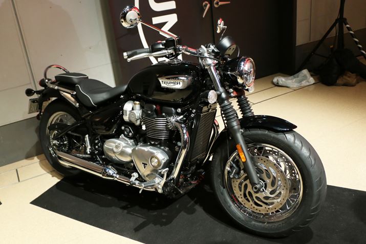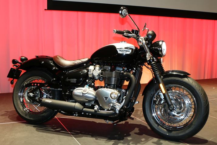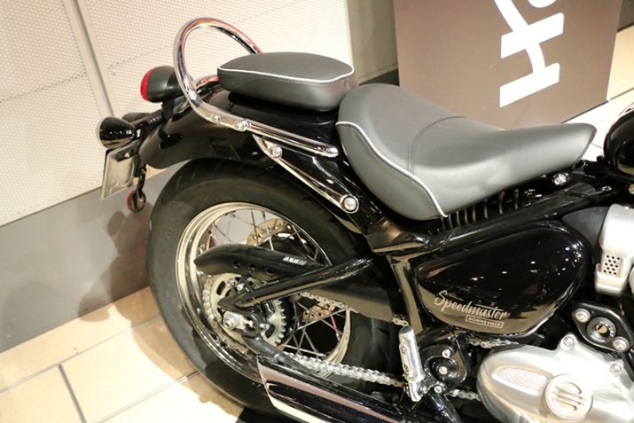 アドベンチャーモデル「タイガー」シリーズに続き、ネオレトロ路線(トライアンフでは「モダンクラシック」と称している)を牽引する「ボンネビル」シリーズに加わった新モデル「ボンネビル スピードマスター」も発表された。「ボンネビル スピードマスター」は2017年に登場し、大きな人気を博した「ボンネビル ボバー」のイメージを引き継ぎつつ、2人乗車を可能にしたモデルで、余計なものを削ぎ落とし低く構えた車体が特徴な「ボバースタイル」となっている。リア・サスペンションを低く構えたシート下に収め、一見するとサスペンションのないリジッド構造に見えるようにしているのもポイントだ。「ボンネビル スピードマスター」の発売日は2018年4月7日。