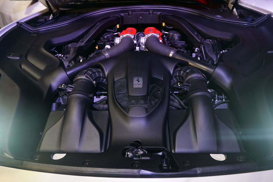 搭載される3,855ccの90°V8ターボエンジンは、最高出力441kW(600馬力)、最大トルク760Nm。これに、7速のデュアルクラッチトランスミッションを組み合わせる。このエンジンは、排気量1リッターあたり156馬力というパワーを実現し、前モデル「カリフォルニアT」と比較すると最大出力で40馬力ものパワーアップを果たした。ボディは、各部を中空構造化できる砂型鋳造や、コンポーネントの一体化を推進することで、「カリフォルニアT」と比較して、ねじれ剛性を35%強化しつつ、約80kgもの軽量化を実現している。