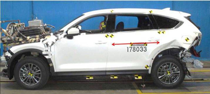 車両後方からの追突への安全性を確認する時速80kmのオフセット後突テストを行ったCX-8。ドア部分が変形していないことがわかるだろう