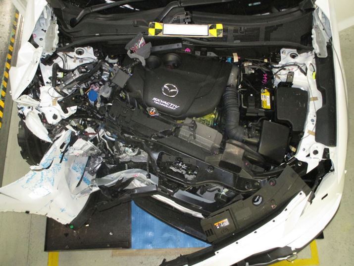 前方のオフセット衝突実験で大きくゆがんだCX-8のエンジンルーム。巧みに衝突エネルギーを吸収しつつ、キャビン部分の変形を抑えるさじ加減が重要になる