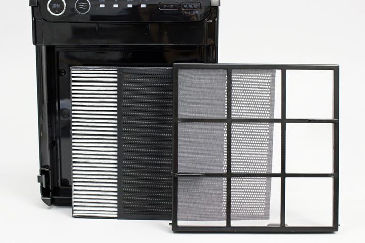 サイズが大きい理由は、本格的なフィルターによる空気清浄機能を装備しているから。一般の空気清浄機と同じく、プレフィルター、脱臭フィルター、集じん・脱臭一体フィルターが搭載されています