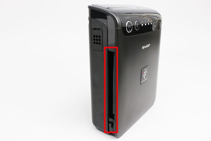 家庭用の空気清浄機が小さくなったような構造で、本体両サイドに吸込口を装備(赤い囲み部分)。ホコリセンサーとニオイセンサーを搭載しており、自動モードにしておけば空気の汚れに応じて風量が自動で調整されます