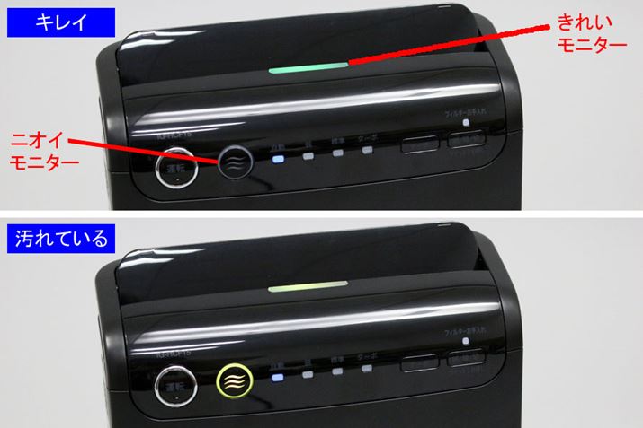 センサーで検知した空気の汚れは、「きれいモニター」のランプの色と「ニオイモニター」の点灯/消灯で知らせてくれます