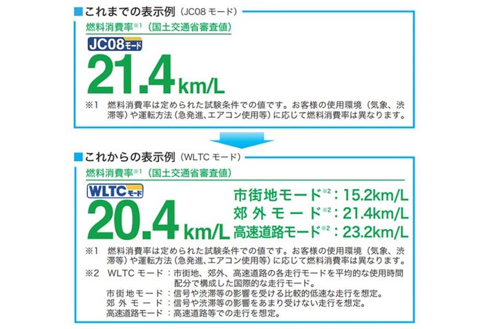 2017年夏以降、WLTCの認可を取得した車種から、同モードに基づく燃費「WLTCモード」の燃費値がカタログに記載され、ユーザーは自身の走行環境にあわせて、実態に近いモード燃費を確認することが可能となった(以上、マツダCX-3プレスリリースより引用)。