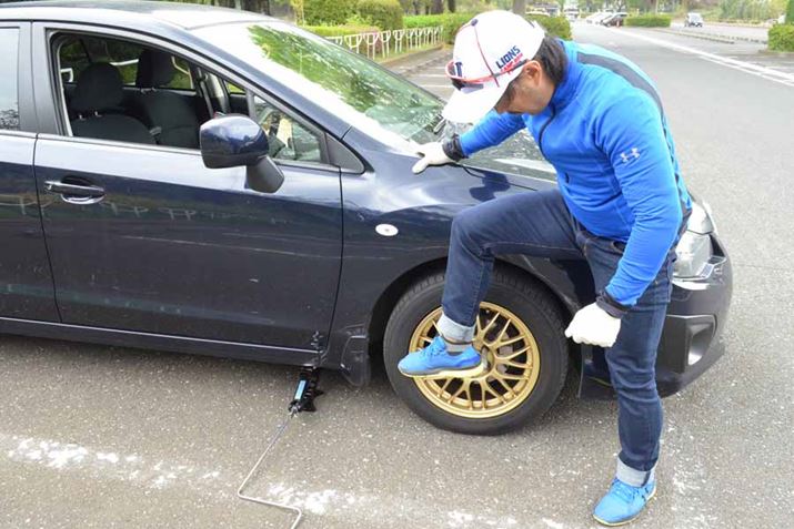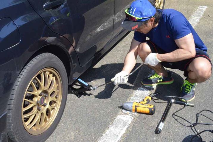 ホイールナットを外す作業もひと苦労。クルマに備え付けのL字型のレンチを使うのですが、全体重をかけても動かないこともしばしばです