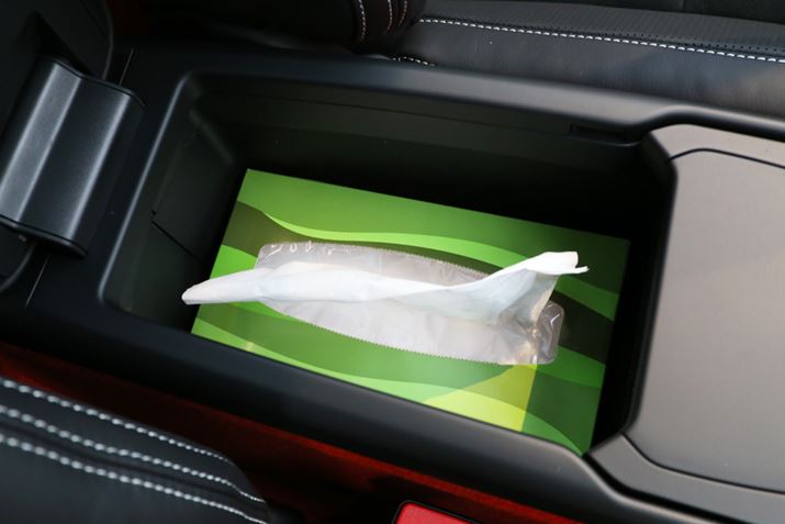 ボルボ「XC40」のセンターコンソールはティッシュボックスがちょうど入る大きさとなっており、手前には小型のダストボックスも用意されている
