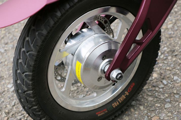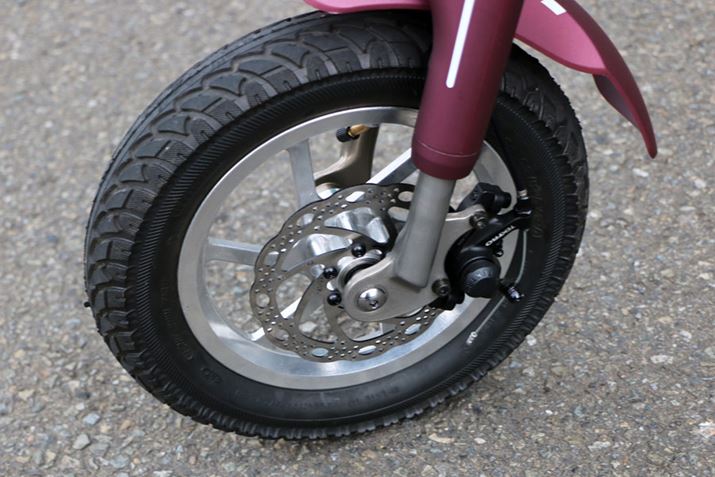31.5cmの小径ホイールには、自転車などに採用される機械式のディスクブレーキを装備。タイヤは電動バイク専用に設計されている
