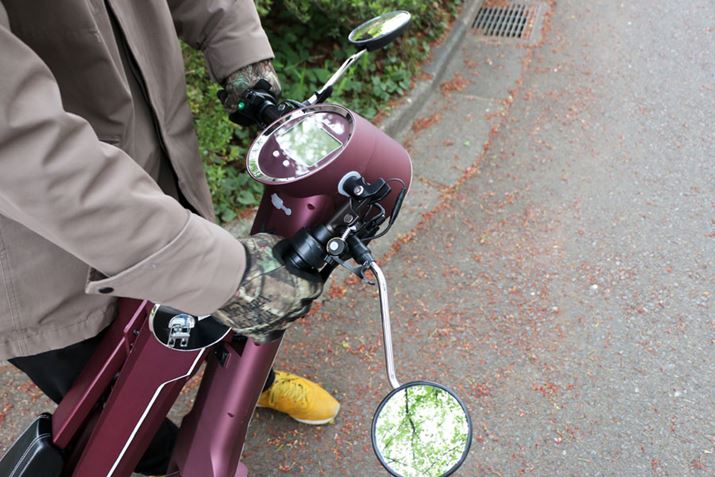 ハンドルも折りたためるが、ミラーは横に飛び出した状態に。自動車に載せたい時は、スパナを使ってミラーを外してしまったほうがいいかもしれない