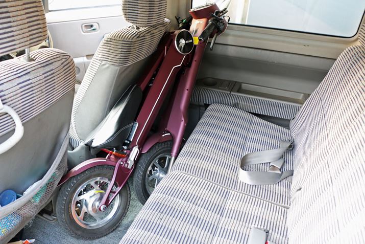 ミラーを取り外せば、自動車の後部座席の足元に立てかけることができた。ミラーが付いたまま折りたたんでもサイズは60(全長)×120(高さ)cm×35(ハンドル幅)cmなので、トランクに寝かせて積載すれば問題ないだろう