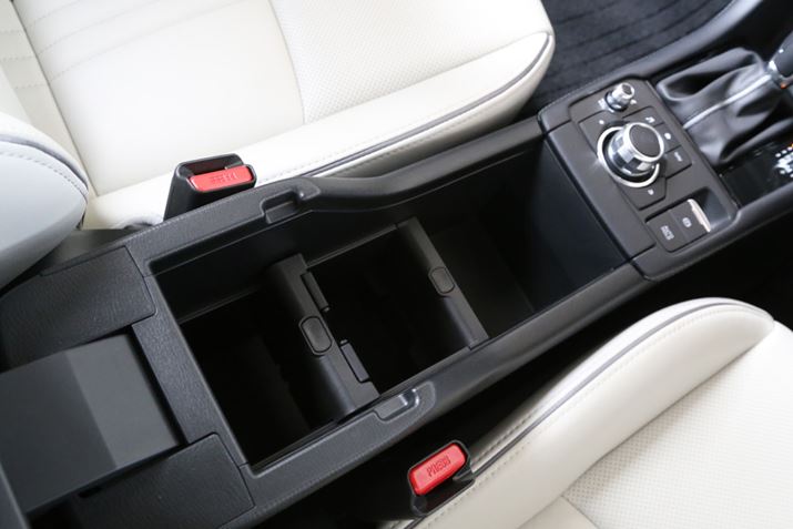 フロントセンターコンソールには、アームレストが新設された。画像はアームレストを開いた状態。中の仕切り板は動かせるようになっていて、工夫次第で便利な小物入れとして利用することができる