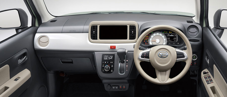 ミラトコットのインパネは水平基調で、ステアリングやカーナビ、エアコン吹き出し口などにはやさしい色合いのベージュが配されている。