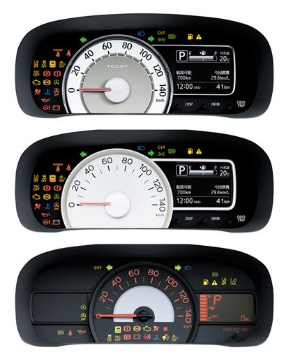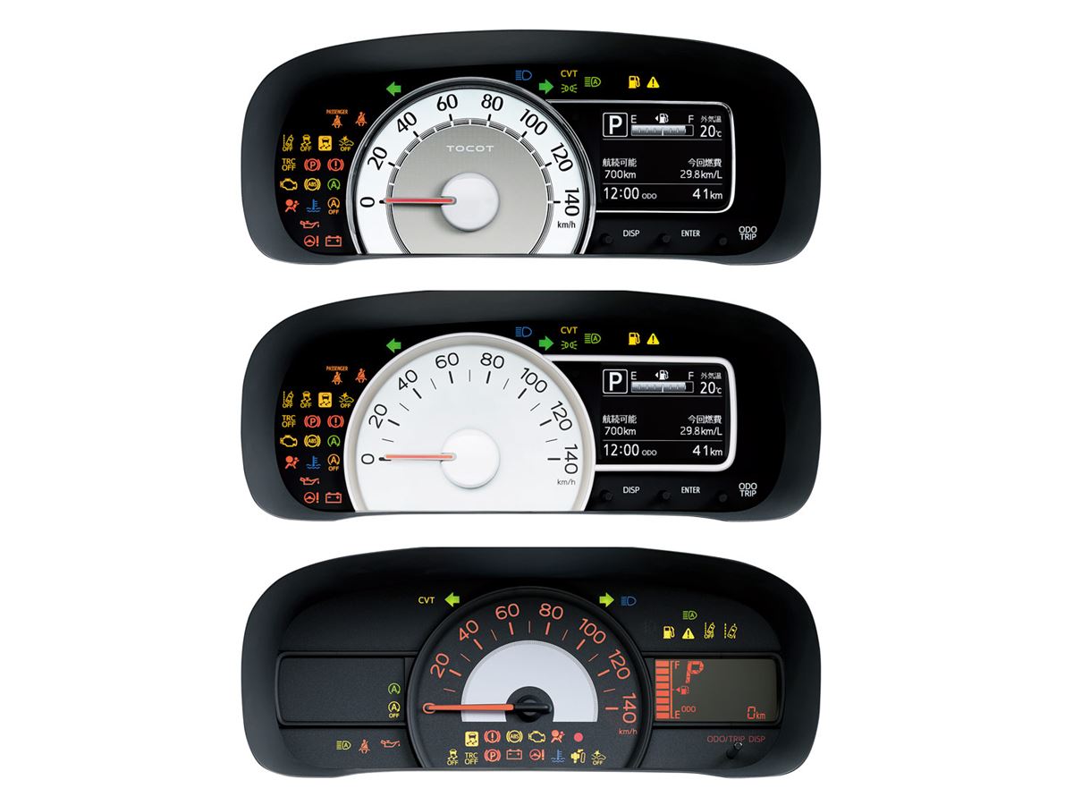 ダイハツ「ミラトコット」のメーター。最上部のメーターは「G“SAIII”」、中央は「X“SAIII”」、最下部は「L」「L“SAIII”」のメーター