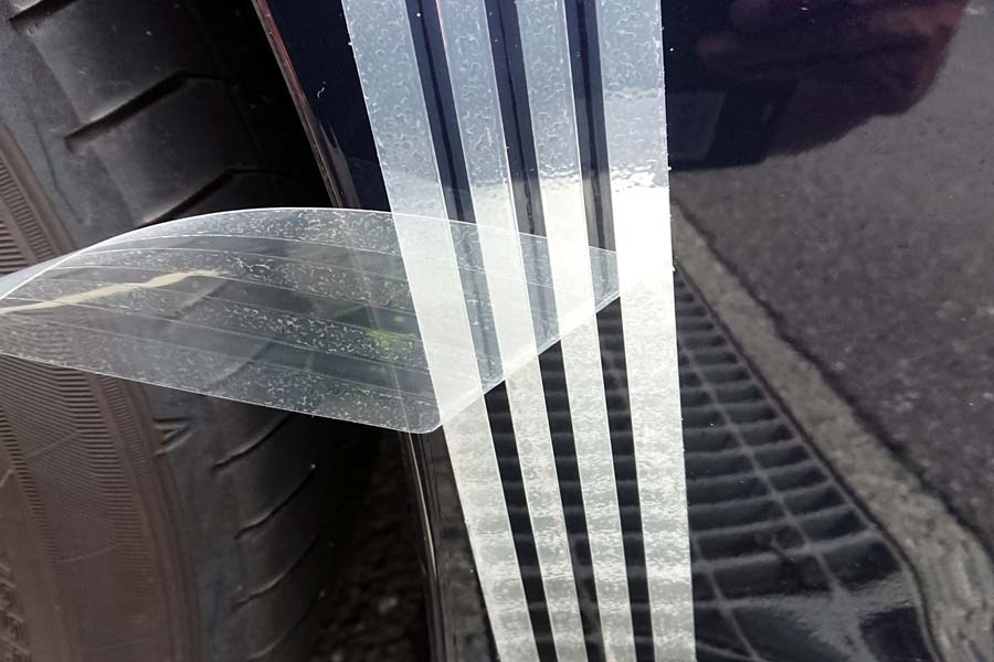 効果が感じられないのはケチって細かくしたせいかも? と思い、フロントバンパーへは切らずに製品そのままを貼り直しました