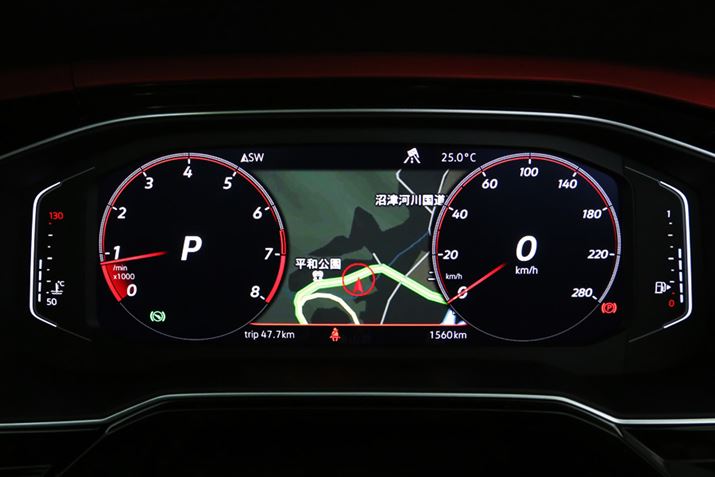 フォルクスワーゲン「ポロGTI」に、オプションで搭載可能な「アクティブインフォディスプレイ」。速度計やタコメーターとあわせて、数種類のグラフィックが選択できるほか、中央にナビゲーション画面を表示させることもできる