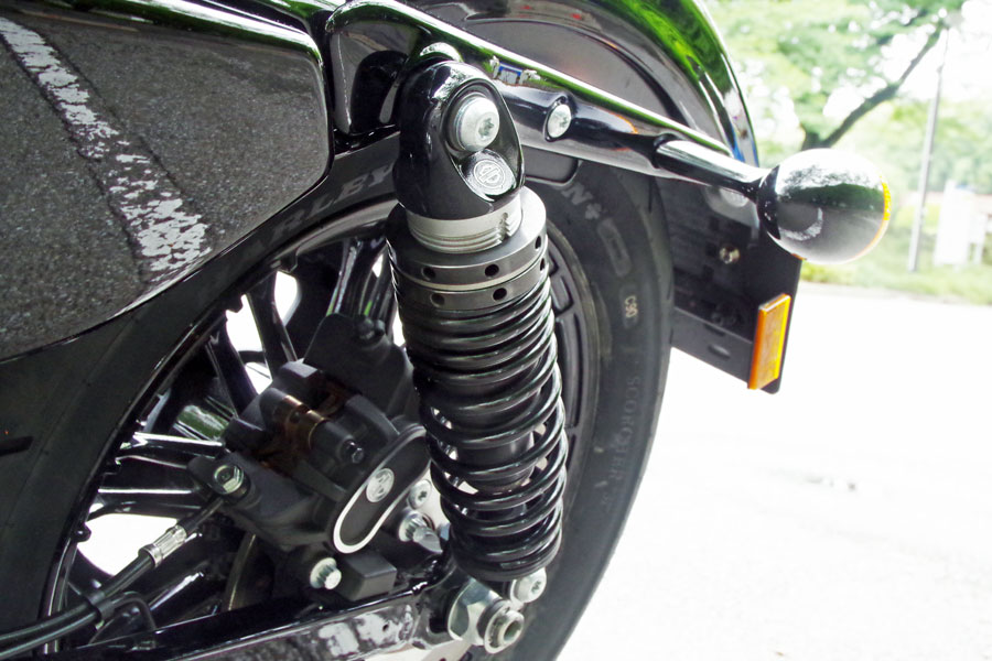 リアサスペンションは、スポーツスターのラインアップの中でもっとも短い280mm。当然ストローク量も少なくなるため、乗り心地はほかのモデルと比べるとハードになる