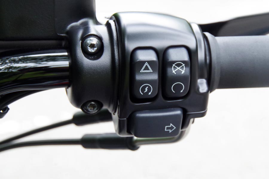 ウインカーのスイッチが左右で異なるのはハーレーの特徴。正直、国産車のように左スイッチボックスで左右操作できるようにしてほしいと感じるが、ウインカーのオートキャンセル機能が標準なのはありがたい