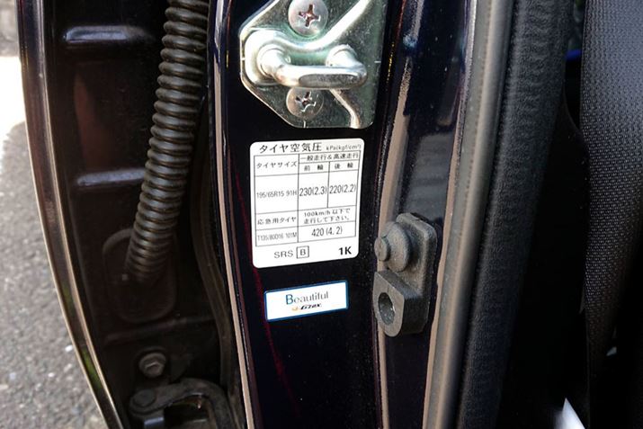 空気圧の規定値は、日本で普通に売られているクルマなら、運転席側のドアを開けるとすぐにわかる位置に表記されており、私の愛車は前輪:2.3kgf/cm2、後輪:2.2kgf/cm2でした。国産車の実用車なら、どれもおおむねこれに近い数字です。