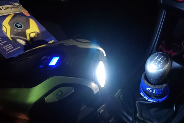 LEDライトもスイッチを入れるだけで点灯。夜間に車内で探し物をする際など、空気を充填するとき以外でも役立ちます