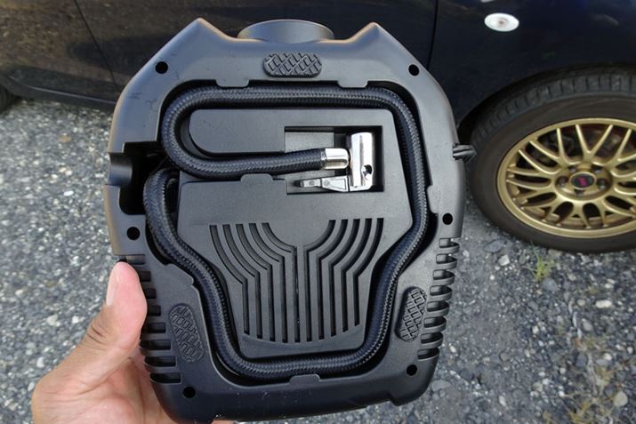 本体の裏にはエアーノズルとコードを格納しやすい工夫が施されています。おかげで、トランク内などに常備してもじゃまになりにくいです
