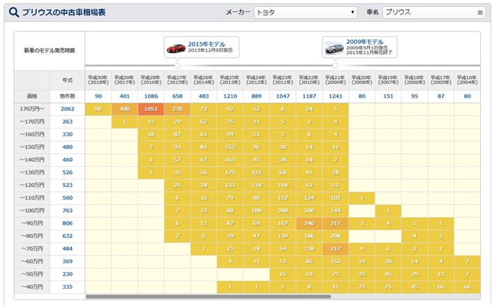 トヨタ プリウスの中古車相場情報画面。年式と価格、物件数がひと目でわかるので、希望の中古車が選びやすい