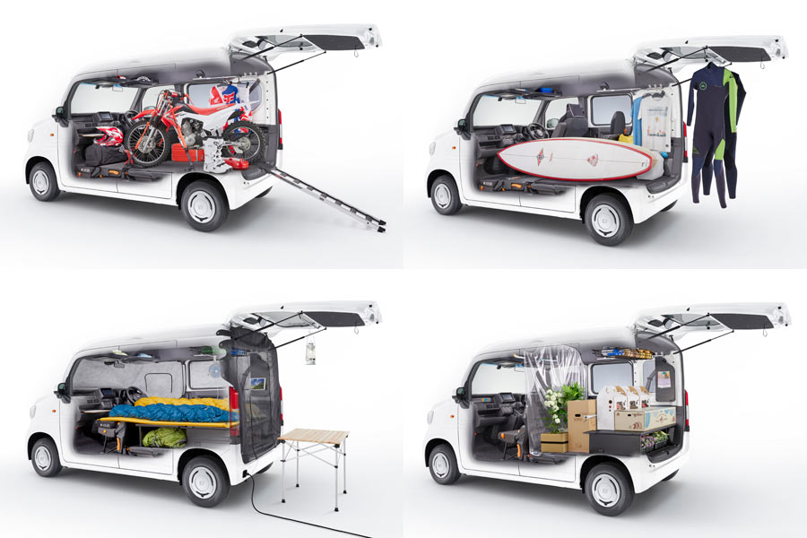 ホンダ「N-VAN」の使用例のイメージ。バイク(左上)、サーフィン(右上)、車中泊(左下)、生花(右下)