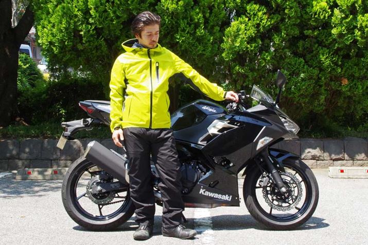 バイク用品メーカーのレインウェアはシルエットがゆったりとしたモデルが多いが、本製品は比較的細身。だが、実際に着てみると意外にも余裕がある。ストレッチ素材を採用しているため、動きをじゃますることもなく、これなら寒い時期に厚手の服を中に着ても問題ないだろう。また、レインウェアではめずらしい淡いカラーが用いられており、ちょっと寒さをしのぎたい時に羽織って出かけても違和感がない。