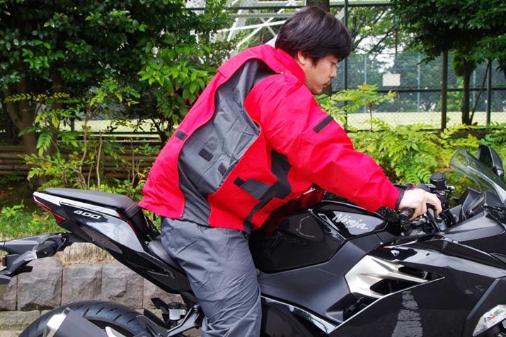 バイクウェアのメーカーとしても35年の歴史を持つゴールドウインのレインウェアは、高級車に乗っているライダーが着用している姿を見かけることも多い。そんなゴールドウインの中からセレクトした本製品は、背部にあるファスナーの開き具合で、「通常スタイル」「バックパックを背負った状態での着用」「ウエストバックを装着した状態での着用」と、3通りの着方ができるようになっている。身につけているバッグに合わせて適切な部分をムダなく広げられるので、雨の侵入も心配ない。実際にバックパックを背負った状態で本製品を試着し、雨の中を1時間ほど走ってみたが、透湿性にすぐれた素材が採用されていることもあり、どこからも水が入ってくることはなかった。これは、同社が長年作り続けているスキーウェアのノウハウが生かされているのかもしれない。