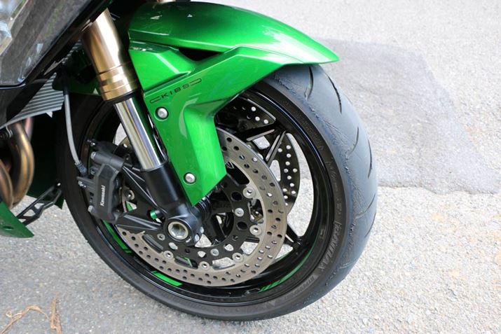 倒立式のフロントフォークにラジアルマウントのブレーキという、ハイパワーなエンジンに見合った制動力を確保。マスターシリンダーもラジアル式でコントロール性も高い