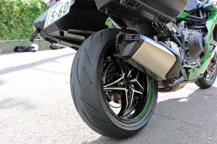 リアは、片持ち式のスイングアームに190/55 ZR17Mサイズのタイヤを履く。容量が大きそうに見えるマフラーは、Ninja H2に比べて軽量化されているという