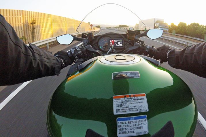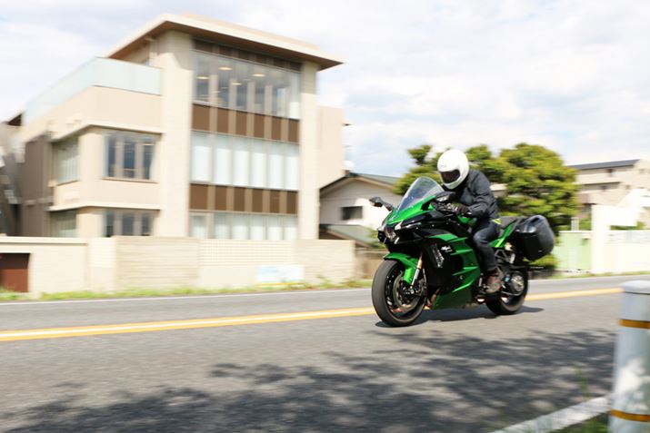 エンジンをかけると、かなり迫力のある排気音が響く。続けて、軽くアクセルを開けて空ぶかししてみると、排気音の中に耳慣れない「キュルキュル」というか「ギュワー」という感じの音が混じって聞こえてきた。これが、スーパーチャージャーが作動している音のようだ。この聞き慣れない音に試乗前の不安が呼び起こされ、恐る恐るクラッチをつないで、まずは低回転で走り出す。すると、これが意外なほど乗りやすい。低い回転数でのトルクは十分なものの、アクセル操作に対して敏感すぎてギクシャクしてしまうようなこともなく、渋滞している街中でも扱いづらさを感じることはなかった。そして、少々慣れた頃、道が空いたタイミングで少しだけアクセルを大きめに開けると、これまでに味わったことがないような加速感が! 同程度の最高出力を持つスーパースポーツモデルにも乗ったことはあるが、そういった自然吸気のエンジンは回転数の上昇にともなってパワーが盛り上がっていく感覚なのに対し、Ninja H2 SX SEは回転数など関係なく瞬時に車体がスピードを増すため、その反応に体というか脳が付いて行けていない感覚を体感した。