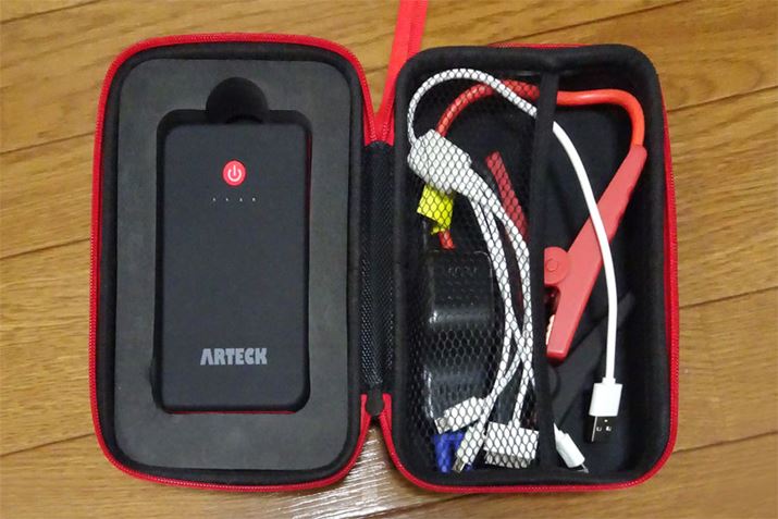 ケース内にスッキリと収まった様子。愛車内の常備のほか、男性ならバッグなどに入れて持ち歩くのに不便を感じさせないサイズです。本体とクルマをつなぐためのケーブル&クランプ、そしてモバイル機器の充電用のケーブルが付属します。ケースとケーブルなどは荷室の片隅に置き、本体はモバイルバッテリーとして使うのもアリでしょう
