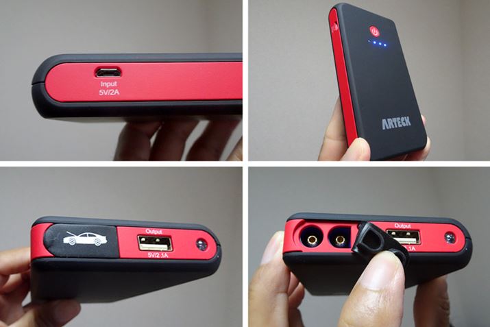 ジャンプスターターへの充電(インプット)は、本体サイドにあるUSB端子から行います(左上)。使い切った状態から満充電まで5〜6時間かかります(右上)。クルマのバッテリーとつなぐコードは、クルマのイラストが描かれた部分の端子から(左下)。その隣の端子は、スマホなどのモバイル機器への充電用です(右下)