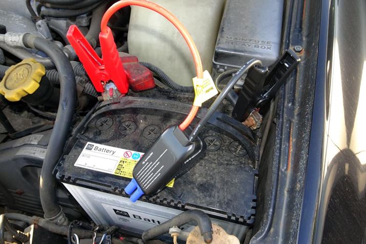 手順は超簡単。付属のクランプをバッテリーの端子に付けて(黒はマイナス、赤はプラス)、本体とつなぐだけ。このとき、クルマ側はキーを回すなどの操作はまだ不要です
