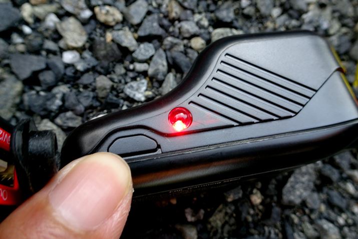 クランプと本体をつないで、このランプが赤く点滅するのを確認したら、写真の指先にあるボタンを長押しします。カチカチという小さな作動音が鳴り、ランプの点滅が緑色になったら準備OK。クルマのキーを回してエンジンを始動させます。取扱説明書に書かれた説明文では、ちょっとわかりにくいかもしれません