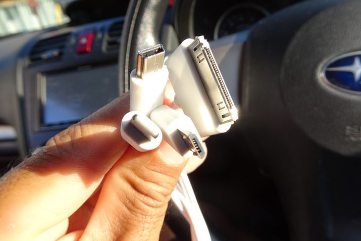 本機とクルマのバッテリーをつなぐクランプ付きケーブルと、各種デバイスを充電するためのケーブル(白)が付属します。使えるのは、アップルのDockコネクタ、Lightning端子、USBミニです