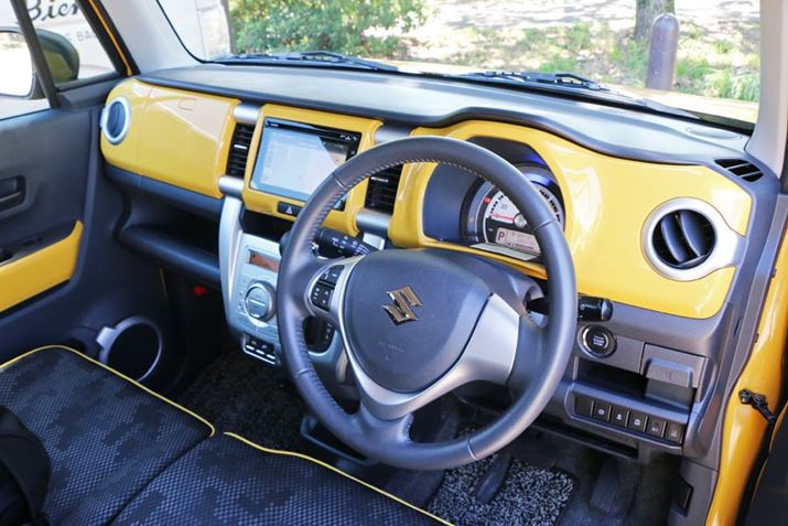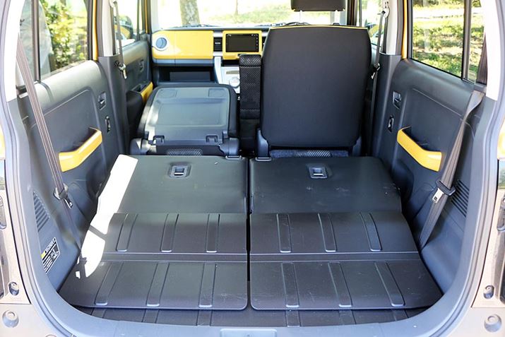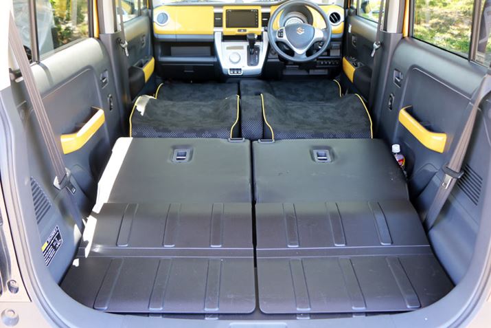 ハスラーはコンパクトな車体ながら、多くの荷物を積載したり、車中泊もできたりするように車内スペースの効率化が図られている。特にシートアレンジは多彩で、前席はヘッドレストを取り外せば背もたれが完全に水平になるようにうしろに倒せるほか、後席は前後で倒す方向を選択可能。ただし、後席は完全に水平になるまで後ろには倒せない。