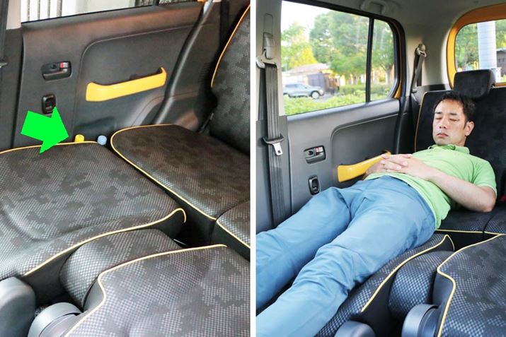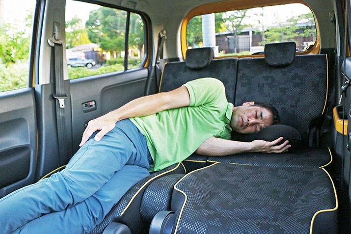 そして、もう1パターンは、前席の背もたれを倒し、後席をリクライニングさせてシートの座面に横になるスタイルだ。シートにクッション性があるので寝心地はいいのだが、リアシートが水平にならないため、身長によっては完全に横にはなれない。175cmの筆者の場合、少し身体を斜めにする必要があった。