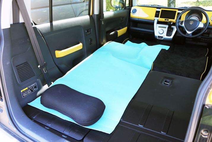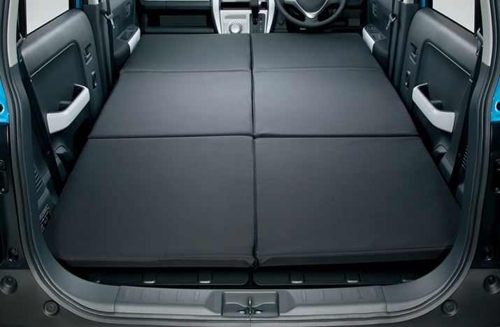 なお、ハスラーには車中泊用のマット「ベッドクッション」がオプションで用意されている。車種専用なので車内スペースにぴったりと収まり、シートの凹凸や背面の硬さもしっかりカバー。また、このほかにも日差しをさえぎるためのシェードや、車内空間を拡張できるアイテムなども揃えられている。
