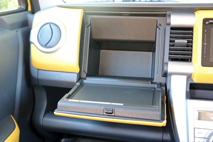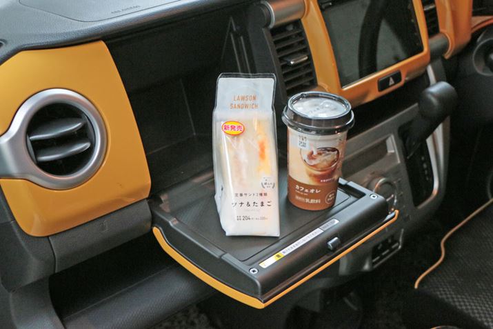 車内で食事をとる時に役立ったのが、助手席側にあるインパネボックスのフタ。開くとテーブルとして使うことができるのだ