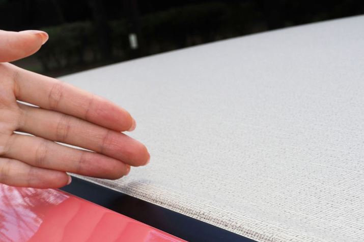 「天井は、今まで見たことがない感じ。布みたいで、なんだかとってもおしゃれですね」と、ルーフを触る宮瀬さん。これは、トートバッグのようなキャンバス地調の質感に見せることができる、「デザインフィルムトップ」です。「えっ、これフィルムなんですか!? 見ためなんて、トートバッグの生地そのものですよね!ちょっとびっくりです」。